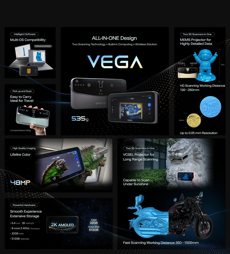 Shining3D EinStar Vega je všestranný, přenosný a výkonný 3D skener určený pro detailní a efektivní skenování v různých prostředích.