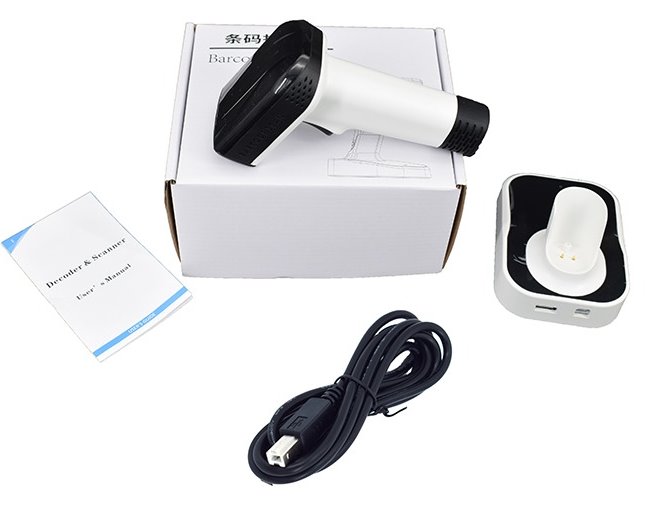 Obsah balení: čtečka čárových kódů, USB 2,4GHz dobíjecí stanice, USB propojovací kabel, návod.
